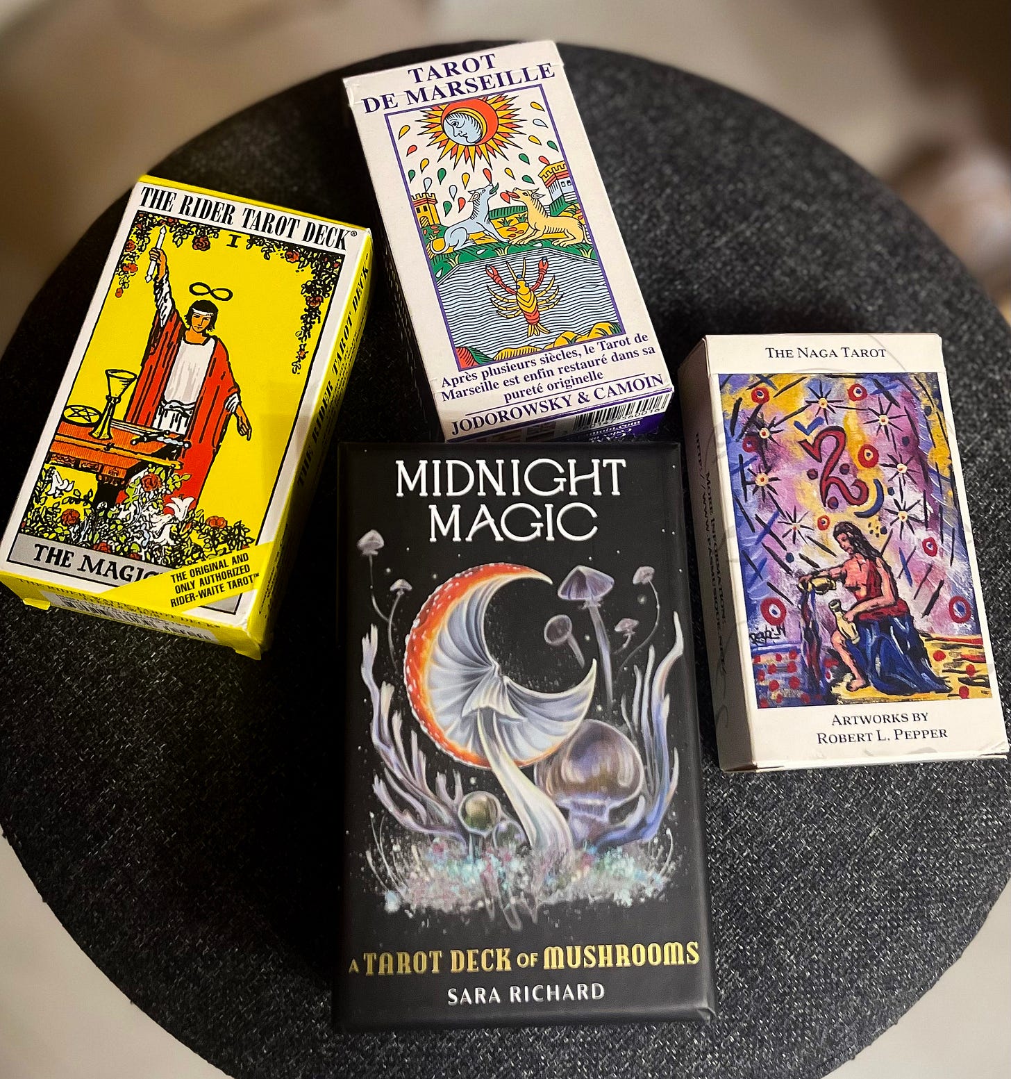 Now, I’m not a Tarot expert, but learning and thinking about the cards is fun. I love looking at the different sets of cards and all their art. I went from thinking it was bunk to owning four sets of tarot cards pretty fast.